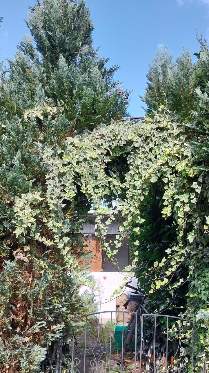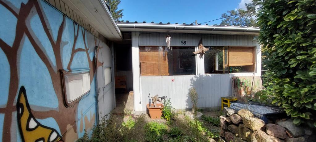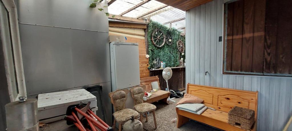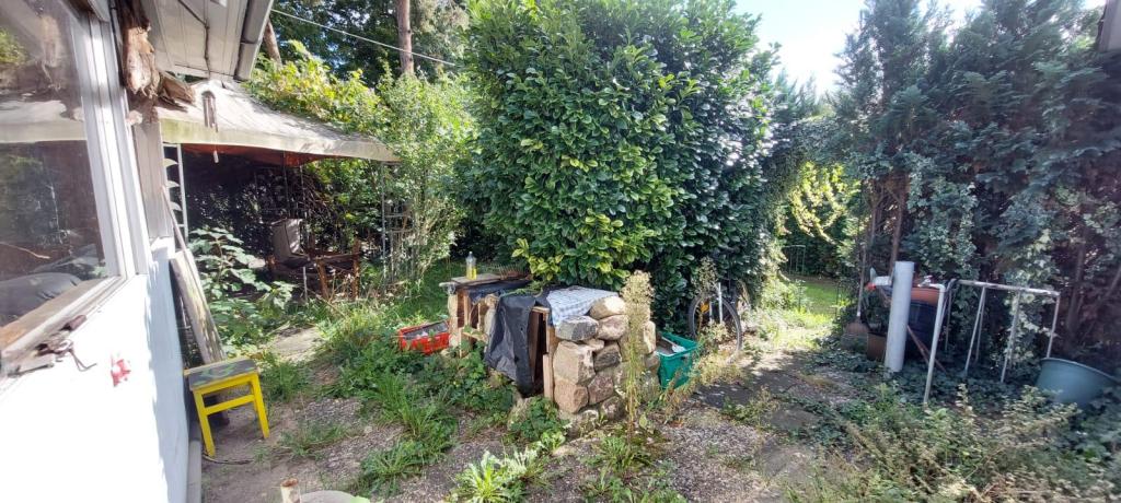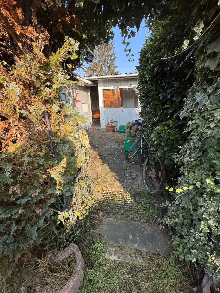 Auf dem 165 qm großen Grundstück steht eine Laube mit ca. 30 qm an die sich eine Veranda mit ca. 12 qm anschließt. Es ist ein baufälliger Wohnwagen mit ca. 8 qm und zwei Schuppen mit insgesamt ca. 18 qm vorhanden. Die überdachte Terrasse misst etwa 5 qm.