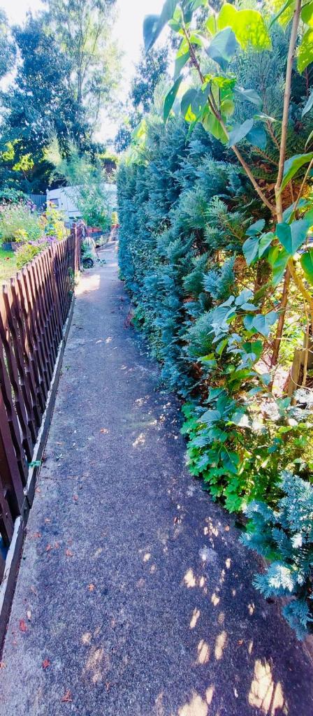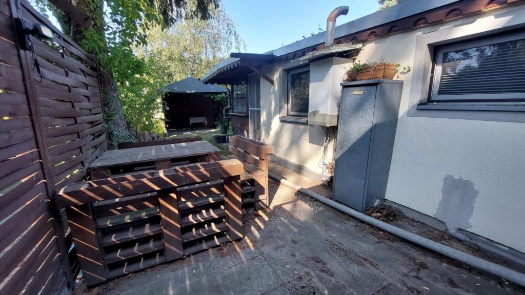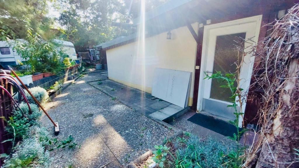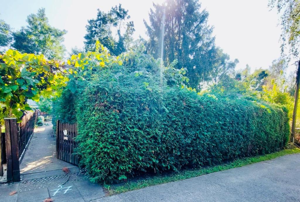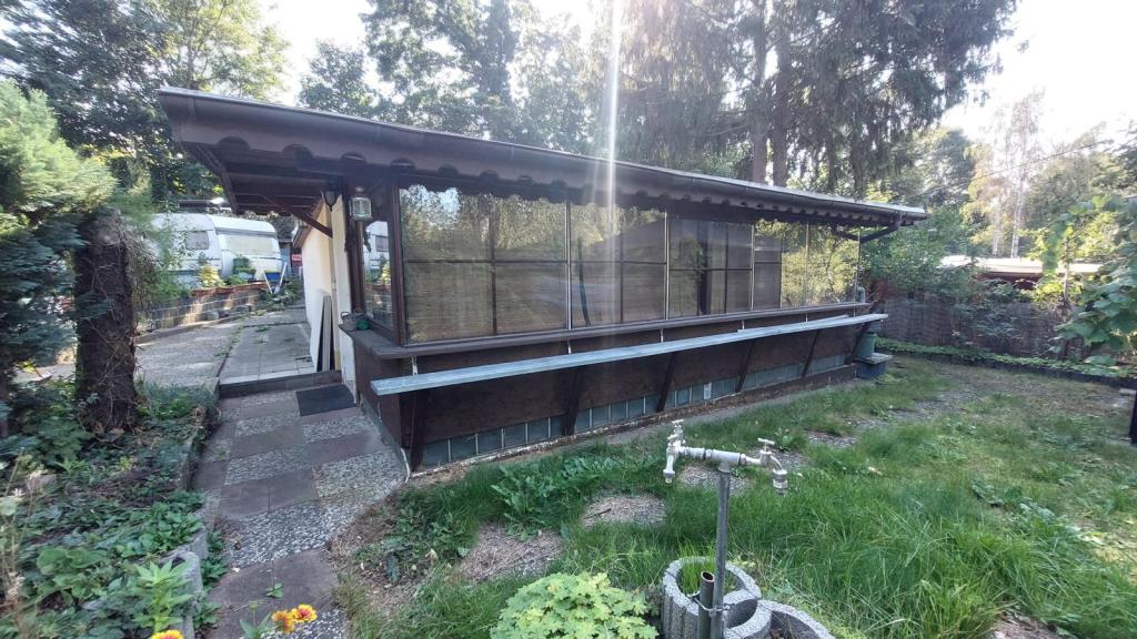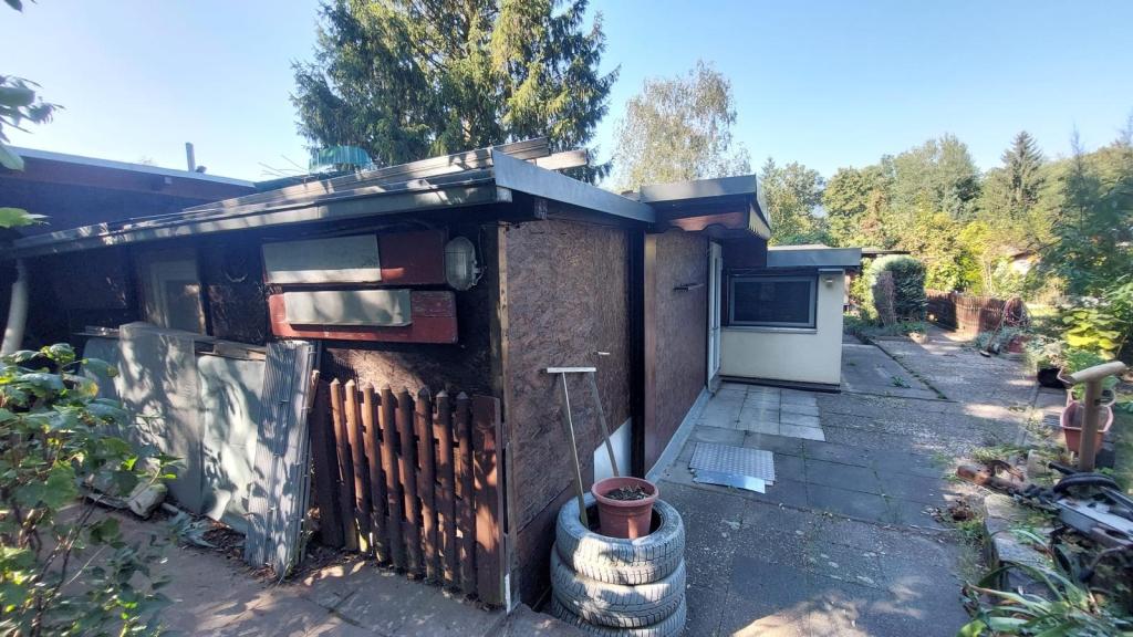 Auf dem 289 qm großen Grundstück steht eine Laube mit ca. 47 qm, an die sich eine Veranda mit ca. 18qm anschließt. Zudem ist eine überdachte Terrasse mit 9 qm und Schuppen mit insgesamt ca. 22 qm vorhanden.